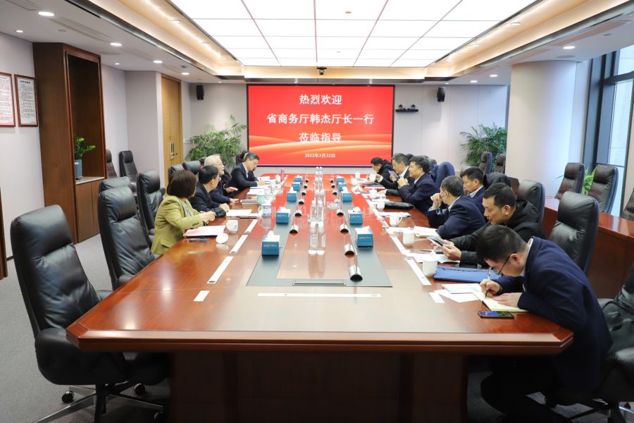 3月22日下午,省商務(wù)廳黨組書記、廳長韓杰一行到省國貿(mào)集團(tuán)調(diào)研,一級巡視員胡濰康,黨組成員、副廳長高秉學(xué),對外貿(mào)易發(fā)展處、電子商務(wù)處、辦公室等部門負(fù)責(zé)人陪同調(diào)研。集團(tuán)黨委書記、董事長樓晶,黨委委員、副總經(jīng)理張勇,專職外部董事陳國榮,辦公室、經(jīng)營部及國際供應(yīng)鏈負(fù)責(zé)人參加座談。