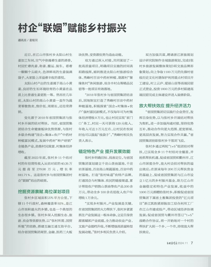 近日,《浙江共產(chǎn)黨員》雜志刊登《村企“聯(lián)姻”賦能鄉(xiāng)村振興》文章,報道省國貿集團自2018年以來,依托張村鄉(xiāng)農業(yè)農村資源,深入開展產(chǎn)業(yè)幫扶、推動鄉(xiāng)村振興,打造張村鄉(xiāng)-省國貿集團結對幫扶“共富樣板”的積極探索與成效。